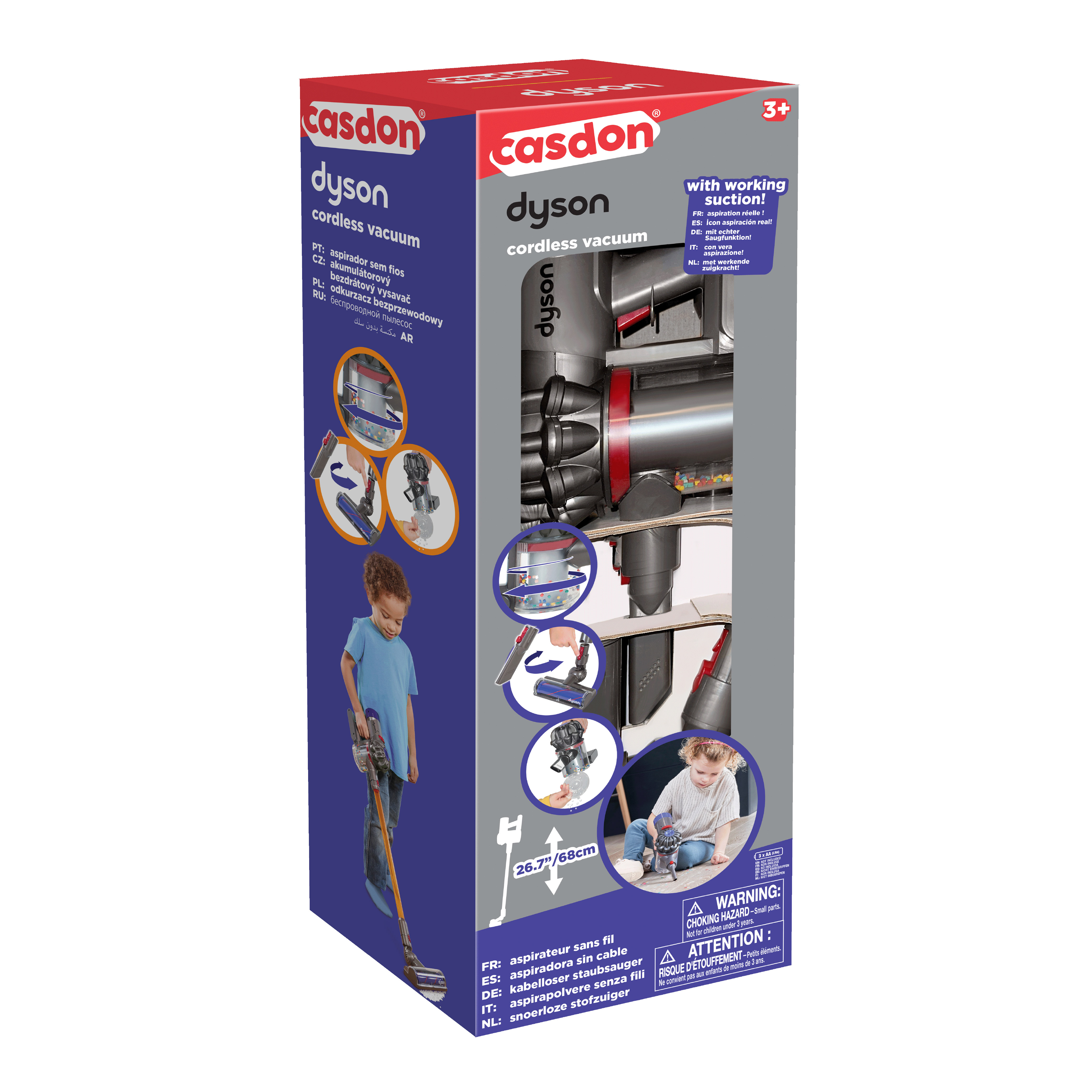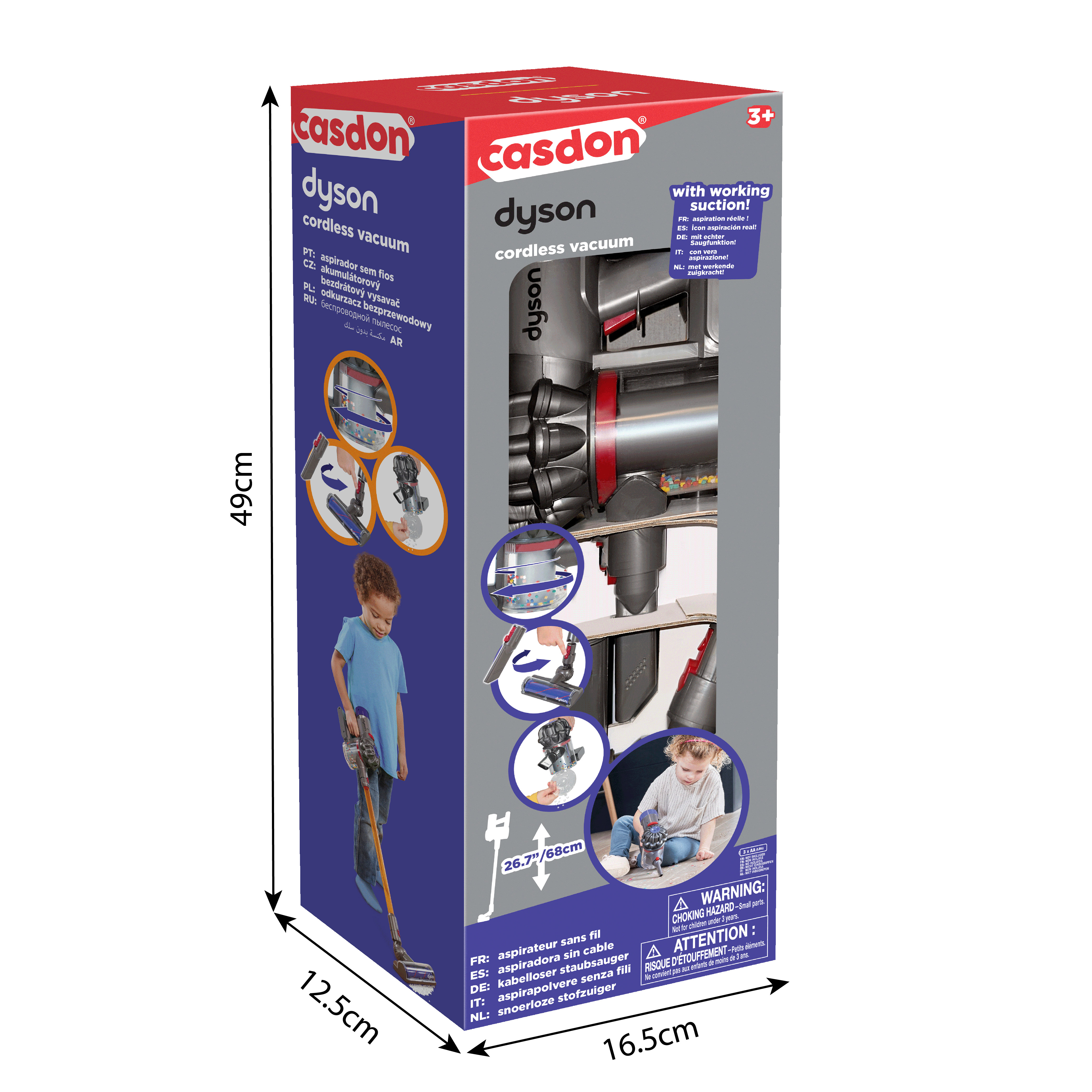 Step into a world of imaginative play with our officially licensed Dyson vacuum cleaner toy! Inspired by the iconic Dyson Cordless Vacuum, this mini-me version offers endless fun and developmental benefits for your little ones. This miniature toy vacuum cleaner mirrors the real deal, allowing little oness to mimic adults as they tidy up. The simulated cyclone action adds a mesmerizing touch, captivating young minds and enhancing cognitive development. Whether they're imitating grown-ups or embarking on solo cleaning adventures, your child will develop a sense of independence and responsibility. With multiple play options, from assisting with chores to creative role-play scenarios, the fun never ends! Designed to promote hand-eye coordination, fine motor skills, and imaginative thinking, this mini Dyson is a valuable addition to any playroom. Let your child explore the joys of cleaning and unleash their creativity with this delightful toy vacuum!