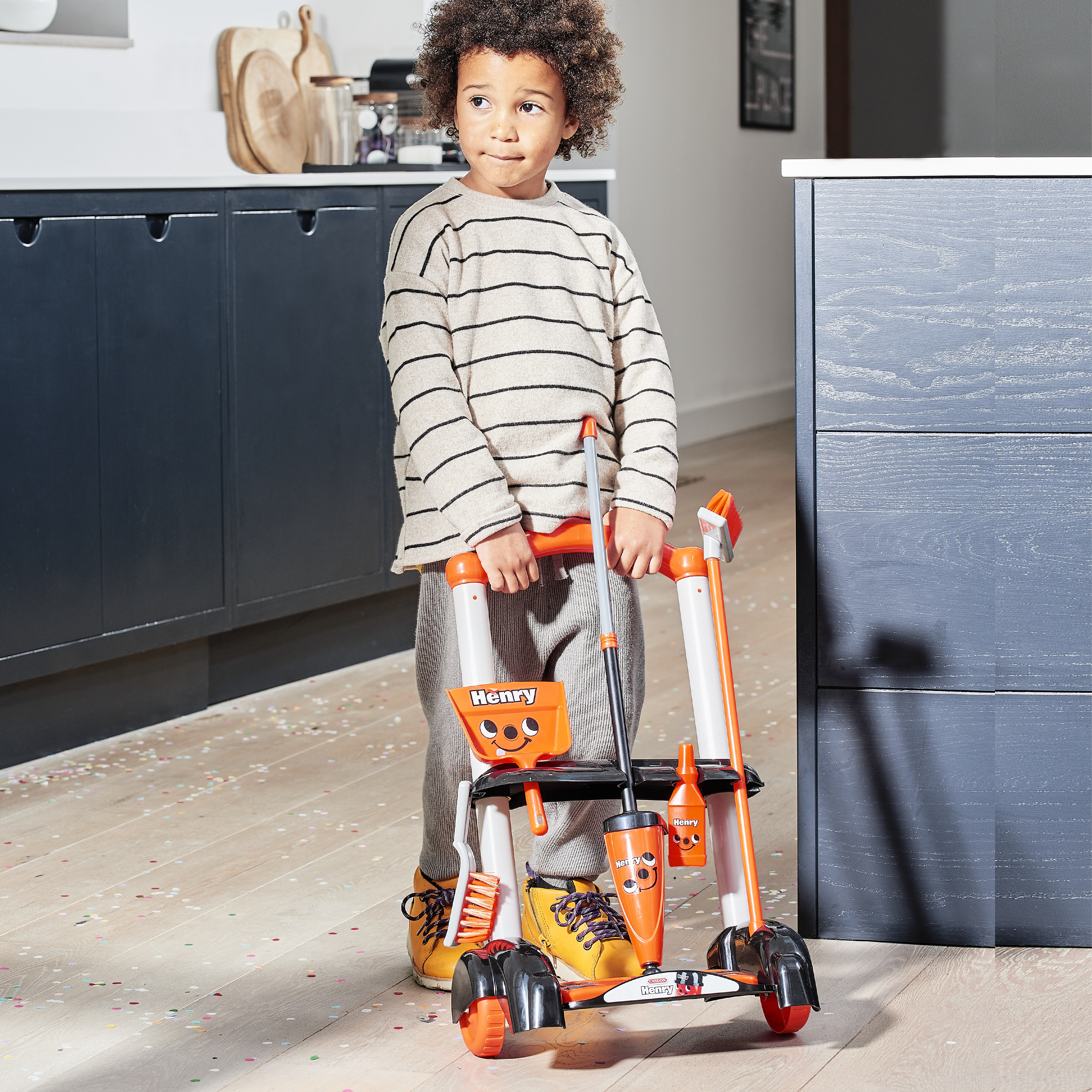WHEEL AROUND A FRIENDLY FACE. Everything is better when Henry is around, kids can find his friendly face on all the cleaning tools, and thanks to the sturdy handle and wheels they can wheel the toy trolley from room to room with ease |