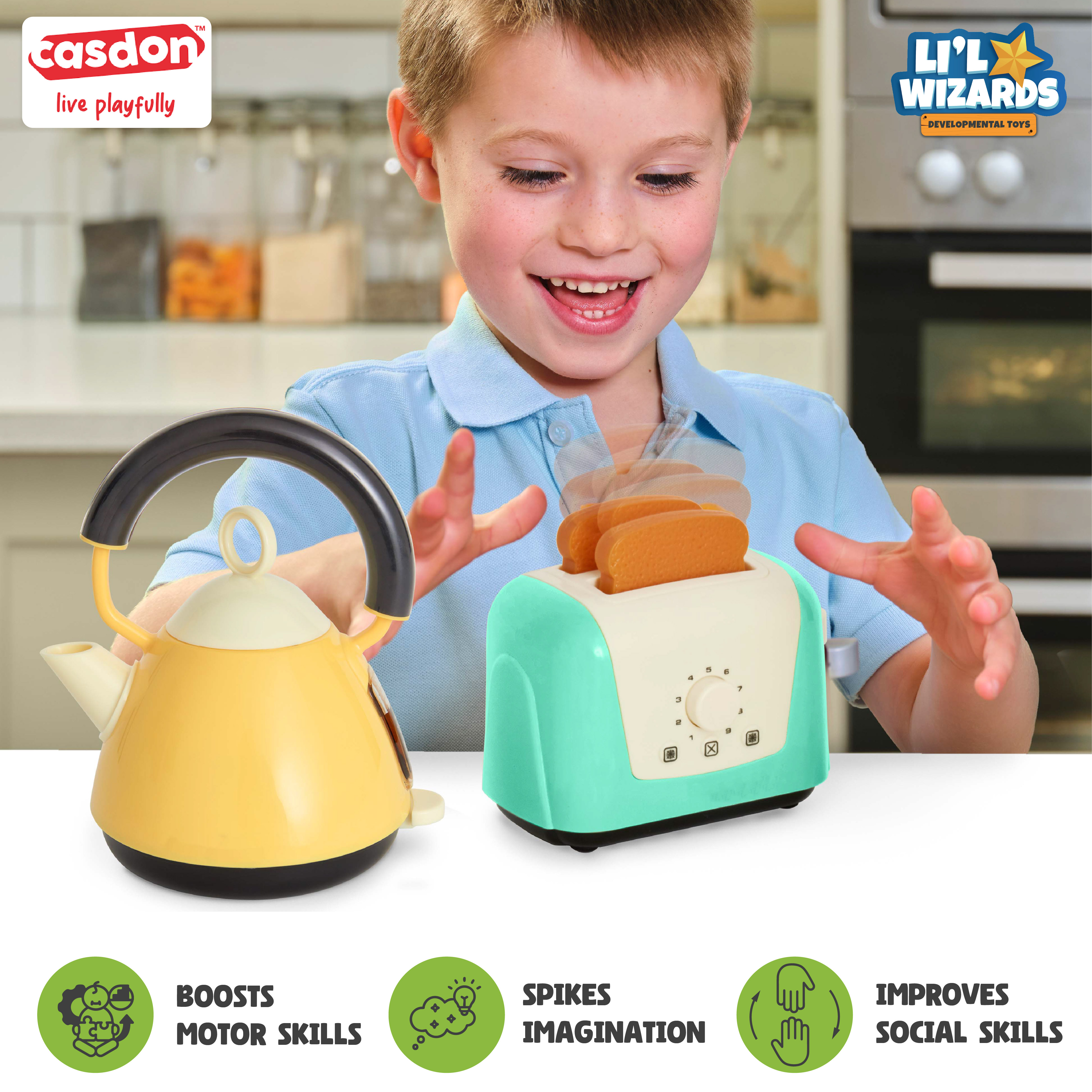 INCLUDES: Toy toaster and kettle with two pieces of play toast. |